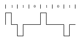 The CDI(Conditioned Diphase Interface) bipolar line code is actually a slightly different form of the original FM line coding used in single-density disk drives and audio cassette tapes. Marks are encoded as alternate polarity full period pulses. Spaces are encoded by half a period at the negative voltage and half period at the positive voltage. This coding scheme has the advantage that it requires less logic to implement than HDB3.