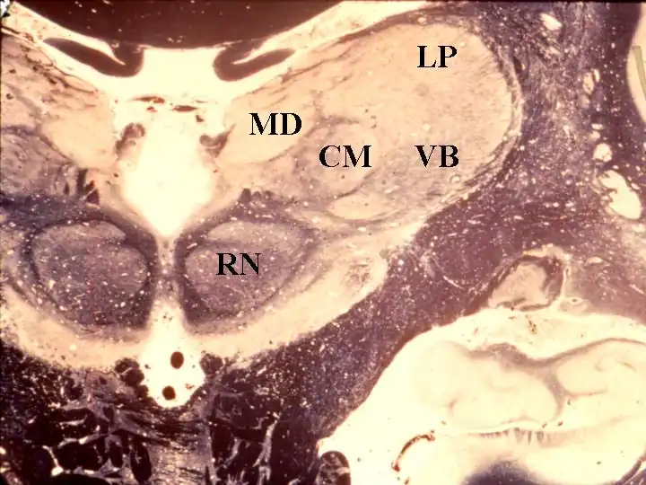 The Intralaminar Nuclei of the thalamus. The white space above and to the left of RN is the third ventricle. MD=mediodorsal nucleus. CM=Centromedian nucleus, RN=red nucleus (not part of thalamus) The black areas are stained white fibres. Picture from: http://www.neurophys.wisc.edu/ University of Wisconsin and Michigan State Comparative Mammalian Brain Collections. Preparation of image has been funded by the National Science Foundation, as well as by the National Institutes of Health. May only be used with these acknowledgements.