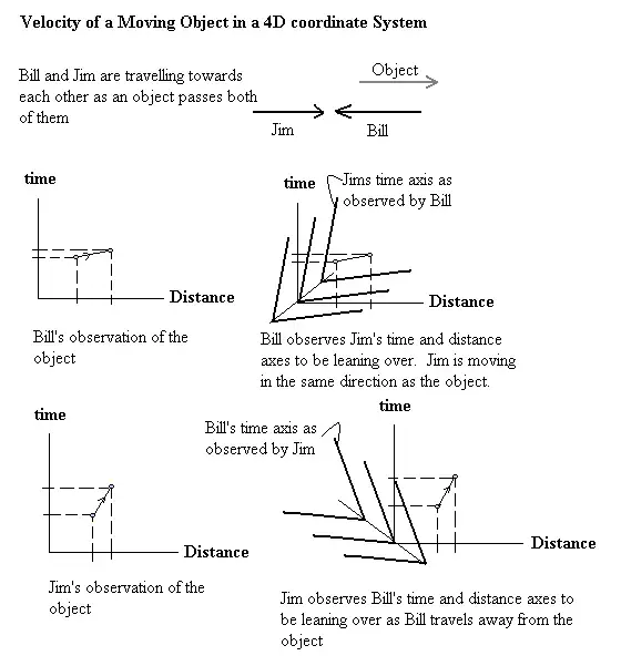If time and space are affected by the four dimensional nature of the universe then velocity, which is the ratio of distance travelled to time taken, should also be affected. In the simplest case, where Bill and Jim are travelling towards each other they both obtain the same value for the velocity of approach. This is because Bill and Jim are symmetrical, either can consider either to be moving. The symmetry disappears however if both Bill and Jim are observing an object moving relative to both of them. Suppose there is an object moving at v relative to Jim and Jim is moving at J relative to Bill, what is the velocity of the object relative to Bill?