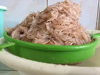 Tiny shrimp or krill are first cleaned, then mixed with salt. This combination is left to ferment for 1–2 months to make a savory condiment.[1] On its own, the paste is grey, but it is often colored pink using rice inoculated with a red mold.[1] It has a fishy, umami flavor.