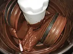 As mentioned, a ganache is the result of emulsifying a large amount of hot liquid—usually cream—with chocolate.[2][8] Fluid ganache can be made into mousse or used as a softer chocolate coating than pure melted chocolate, and solidified ganache is often made into a variety of chocolate confections.[7]