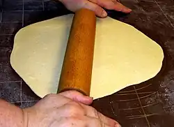 Dough (pâte in French, pasta in Italian) is a thick paste made of moistened flour.[1][2] This step is a precursor to its use in cooking in numerous ways such as making bread, pasta, noodles, pastry, cookies, and muffins, among others.