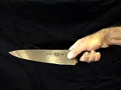 When slicing food by hand, always grip the handle of the knife firmly—a loose grip can lead to accidents. The correct grip provides the maximum degree of control over the knife. It increases one's accuracy and speed, as well as preventing slipping which can cause accidents. The type of grip one uses depends to some extent on the task being performed, as well as the size of the knife. The grip most frequently used for general cutting and slicing is the one illustrated. Grasp the handle in the palm of the hand with the thumb on one side of the blade, the forefinger on the other side, and the middle, ring and small fingers wrapped around the handle. This is commonly referred to as a "pinch grip" and is believed by many food-service professionals to give maximum control. Those without culinary training often grip the handle with all four fingers and the thumb gathered underneath.