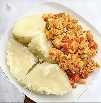 Nigerian egg stew is a flavorful dish made by cooking beaten eggs with chile pepper and onion in palm oil. It resembles scrambled eggs with a spicy twist and is commonly served with boiled yam, cocoyam, or potatoes.