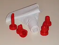Piping tips are cone-shaped, with a base too large to fit through the small opening in the bag; they are to be inserted through the larger opening before food is spooned in. Many types of piping tip are available, coming in an array of shapes and materials. Tips are typically made of stainless steel, chrome-plated metal, or food-grade plastic. Circular nozzles are quite useful for making round shapes. The tip shown in the far left of the photo is a hypodermic-shaped one for filling pastries such as cream puffs, and many other types of nozzle are available for making star, leaf, and flower-petal shapes.