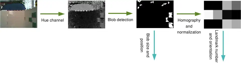 The second figure depicts a possible workflow to detect a landmark. This problem is trickier than the previous one. Here is a possible solution. First, the hue channel of the image can be computed. With this color space, it is easy to distinguish the four landmark colors. Then, a blob detection is performed on this information. The size of the blob gives clues about the distance of the landmark. The blob which seems to be a landmark is straightened out (for example with a homography[6]), and is normalized (for example on a 4x3 matrix). It's now easy to compare the result with a database to get the number of the landmark.