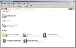 After the installation of your Bluetooth device, an icon named ”My Bluetooth Places” is appeared on your desktop. If it is not the case, right click on the Bluetooth icon in the system tray and select ”Start using Bluetooth”. Double-click on the ”My Bluetooth Places” icon. If you use ”My Bluetooth Places” for the first time, this action will open a wizard. Follow the instructions of this wizard up to arrive at the window depicted in the first figure of the wizard. If you already used ”My Bluetooth Places”, click on the ”Bluetooth Setup Wizard” item. This action will open this window.