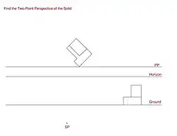 1: Cite points along the picture plane and draw vertical construction lines to perspective view. Then draw construction lines from the side view, parallel to the ground line, and draw passed the vertical lines in the perspective view.