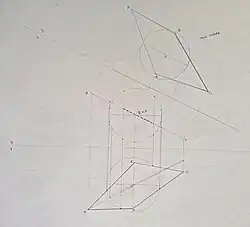 Using this information, we can construct the corresponding section of the sphere in the other view. The points where the line intersects this section can be transferred back onto the line to find the piercing points of the line and the sphere. We can project these back to the first view.(Fig2.3)