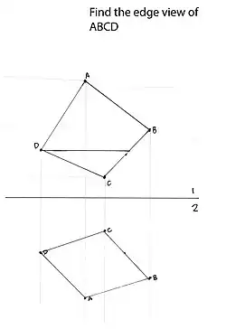 Edge view is a view looking at one side of a plane. Planes in edge view are shown as lines that are the distances of the edges of the shape. To get edge view, take a view parallel to a side of a plane. Then take another view perpendicular to the new line. Alternatively, if you already have front and top views of the plane, to get an edge view you may draw - in either view - a line from one side of the plane to the other that is parallel to the folding line, transfer this line to the other view, and then take a view perpendicular to the line from that second view. Use transfer distances from the first view to get the endpoints of the plane and complete the edge view of a plane.