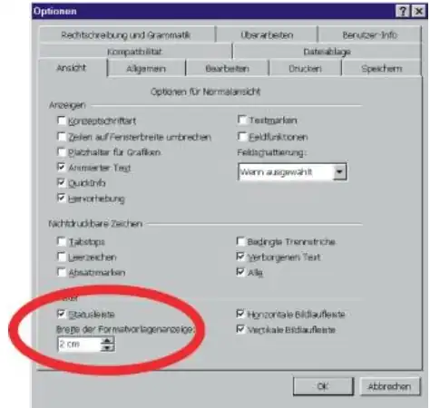 You can see the left row within the word window. This is the so-called structured view, which you can get by choosing the Normal option under View. The names of the paragraph structures are displayed if you choose the point Options under Extras. Within the popup menu there is a possibility to set the width of the style sheet view. (see below). This is how it is displayed in German Word97, but is similar in other language word systems.