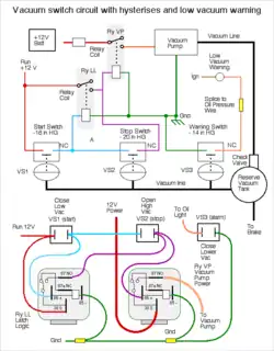 For vehicles with vacuum operated power brakes it is necessary to include a vacuum pump and vacuum reservoir, check valve, pump, pump control, and pump power. Vacuum pumps are powered from the twelve volt vehicle service, usually provided by an auxiliary battery. The circuit illustrated is complex but of low cost. A single vacuum sense unit may be obtained from specialty suppliers which has separate on and off adjustable setpoints, eliminating the need for several relays.