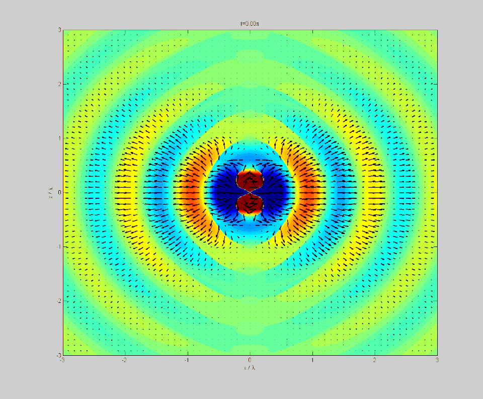 The intensity of the electric field radiated by a dipole is represented by color. The arrows represent the Poynting vector.