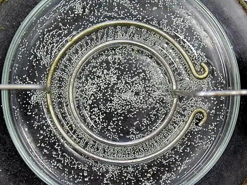 When an electric voltage is imposed across a metal wire, an electric current passes through the wire, which is a current of electrons. The electrons are accelerated by the electric force, but their average kinetic energy does not increase, because they are slowed down by the metal. They lose by heating the metal all the energy they gained, through the Joule effect. Electric light was invented by heating a metal wire carrying an electric current to white heat. The electrical resistance of a material measures its ability to slow down electrons or ions passing through it.