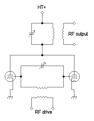 If the output of an amplifier stage is tuned to a multiple of the frequency which the stage is driven with, the stage is optimised to give a larger harmonic output than that found in a linear amplifier. In a push-push stage, the output will only contain the even harmonics. This is because the currents which would generate the fundamental and the odd harmonics in this circuit (if one valve was removed) are canceled out by the second valve. Note that in these diagrams that the bias supplies and the neutralization have been omitted for clarity. In a real system it is likely that tetrodes would be used as plate to grid capacitance in a tetrode is lower so making the stage less likely to be unstable.