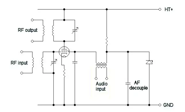 An example of a series modulated amplitude modulation stage. The tetrode is supplied with an anode supply (and screen grid supply) which is modulated by the modulator valve. The resistor VR1 sets the grid bias for the modulator valve, both the RF input (tuned grid) and outputs are tuned LC circuits which are tapped into by inductive coupling.
