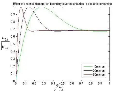 Many groups such as Rife et al. [7], are underestimating the possibilities that acoustic streaming has to offer in channels less than because the inner boundary layer streaming velocity is ignored. The boundary layer effects are present regardless of diameter. In water, the acoustic boundary layer is about 1 micron, therefore, for pipes with diameters on the order ten microns or less, there is a marked increase in the streaming velocity.[6] From the velocity profile of the inner boundary layer streaming in Figure 2, the contribution of the boundary layer factors in favorably as the diameter of the channel decreases. Note that the magnitude of the inner boundary layer streaming is not affected by the diameter and that the percentage of the channel experiencing the boundary streaming decreases as channel diameter increases.