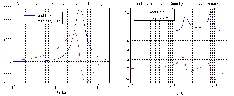 For very low frequencies, the spring term dominates because of the relationship. Thus, the phase of the impedance approaches for very low frequencies. This phase causes the velocity to "lag" the force for low frequencies. As the frequency increases, the phase difference increases toward zero. At resonance, the imaginary part of the impedance vanishes, and the phase is zero. The impedance is purely resistive at this point. For very high frequencies, the mass term dominates. Thus, the phase of the impedance approaches and the velocity "leads" the force for high frequencies.