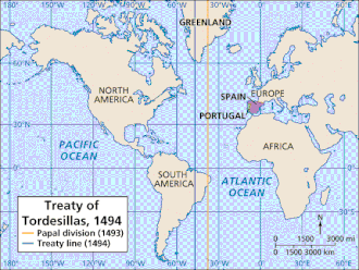 The resolution to this occurred in 1494 at the Treaty of Tordesillas, creating, after long and tense diplomatic negotiations between the Kingdoms of Spain and Portugal, a dividing line 370 leagues west of the Cape Verde Islands. Portugal received the west African Coast and the Indian Ocean route to India, as well as part of the Pacific Ocean waterways, while Spain gained the Western Atlantic Ocean and the lands further to the west. «Unknowingly», Portugal received Brazil. King John II of Portugal, however, seems to have had prior knowledge of the location of that Brazilian territory, for in the difficult negotiations of the Treaty of Tordesillas he managed, in a move still open for debate amongst historians of the period today, to push the dividing line further to the west, making it possible to celebrate the official discovery of Brazil and the reclaiming of the land only in 1500, already under the auspices of the treaty.