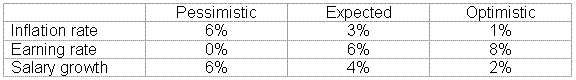 It is common to set up alternative scenarios, e.g. pessimistic, expected and optimistic, and run them through a model. Each scenario will consist of a set of assumptions and inputs chosen by the user. Importantly, the assumptions need to be consistent, so for example, if you assume inflation is only 2%, salary growth is likely to be low as well.