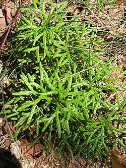 The Huperzioideae, known as firmosses, have also been treated as a separate family Huperziaceae. Firmosses differ from other Lycopodiaceae in that they grow in clumps, instead of producing creeping, horizontal stems like other family members.[1] Of the three genera in this group, Huperzia is a temperate and arctic genus and is the only one found naturally in New York. Of the other two genera, Phlegmariurus is native to tropical and subtropical regions, and Phylloglossum is native to Australia and New Zealand.