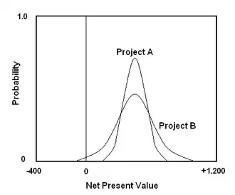 Probability distribution curves for the NPVs of projects A and B, where Project A has a narrower range of possible NPVs. Source: Treasury Board of Canada, Benefit-Cost Analysis Guide, 1998