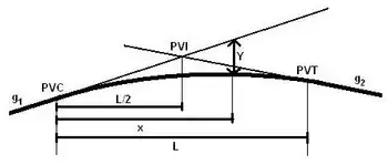 Two types of vertical curves exist: (1) Sag Curves and (2) Crest Curves. Sag curves are used where the change in grade is positive, such as valleys, while crest curves are used when the change in grade is negative, such as hills. Both types of curves have three defined points: PVC (Point of Vertical Curve), PVI (Point of Vertical Intersection), and PVT (Point of Vertical Tangency). PVC is the start point of the curve while the PVT is the end point. The elevation at either of these points can be computed as and for PVC and PVT respectively. The roadway grade that approaches the PVC is defined as and the roadway grade that leaves the PVT is defined as . These grades are generally described as being in units of (m/m) or (ft/ft), depending on unit type chosen.
