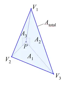 We want to compute a new interpolated value at the pixel center from the values , , and at the three vertices. There are several methods to do this. One is using barycentric coordinates , , and , which are computed this way: