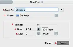 4. Here you can set the time signature of your song, or, in other words, the beats per measure. Use the menu to choose between the different times. 'Note' that the time you choose will affect the number of loops you will be able to use in your project. If you are new to GarageBand, a 4/4 time is a good place to start.