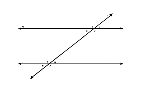 Look at the figure. Given that m and n are parallel, angles 1 and 5, 2 and 6, 3 and 7, 4 and 8 are corresponding angles, and are therefore equal. 5 and 3, 6 and 4 are alternate angles, so they must be equal as well. 5 and 4, 3 and 6 are interior angles, so they must be supplementary. Note that there are also two sets of angles at a point and eight pairs of adjacent angles on a straight line.
