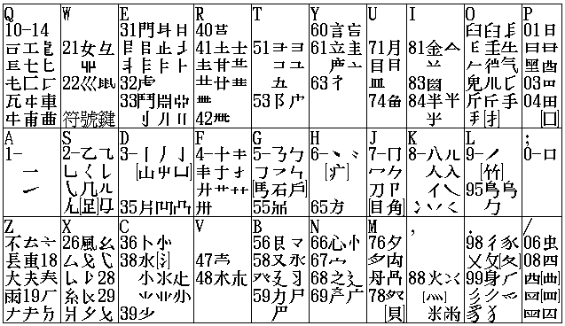 This means that all elements in array input can be expressed as a two digit number or a one digit number and a - sign. Many of the elements share the same number, for example the elements 立 and 亠 are both written as 61 (、(6) and 一 (1) ) but the system is more precise than simply writing the letters of the keys. Also it fits the whole concept of thinking in terms of rows and columns that forms the basis for Array input.