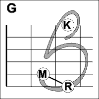 The chord change is complete. Here too, the "G" drawn on the head serves as a reminder.