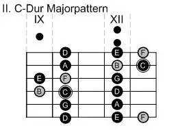 The 5 CAGED scales do not always provide a convenient transition between barre chords, arpeggios and improvisation. They also contain some difficult chord shapes. And if you seeIf you want to play quickly, the place where there are only two notes on one string disrupts the flow of the playing. A few hammerings or slides don't work at all because the corresponding notes are on different strings. You will learn that every fingering on every string (and consequently also on all CAGED scales) can be extended anywhere by two frets to the right or to the left. This of course changes the fingering and causes individual fingers to overextend, but some licks and riffs work better this way. We will derive other scale concepts from the CAGED scales in this way. This way you keep the orientation you acquired with CAGED, because you always know where the square or where the next semitone steps are.