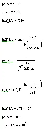 The Half-life of Carbon-14 is 5,730 years (plus or minus 40 years). This means that radioactive emission from the decay of Carbon-14 into Nitrogen-14 after 11,460 years will be one quarter as much or the amount shown in the table above where ~25% of the Carbon-14 has survived. Why? The transition of Carbon-14 into Nitrogen-14 proceeds at the rate of one Half-life every 5,730 years which means that there will be only half as much Carbon-14 in an archeological sample that is 5,730 years old as compared to a sample that is created today. The following is an example of Half-life computation applied to the decay of Carbon-14. (Note: the symbol "ln" in the formula's below is generated by the Wikipedia math markup language and stands for "logarithm." Since there are both natural and base 10 logarithms it must be clarified that "ln" stands for natural logarithms while "log" in the basic code below also represents the natural logarithms.)