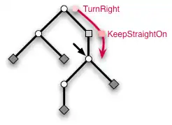"Most importantly, TurnLeft and TurnRight have a sub-labyrinth glued to them. When the player chooses say to turn right, we extend the thread with a TurnRight and now attach the untaken left branch to it, so that it doesn't get lost."
