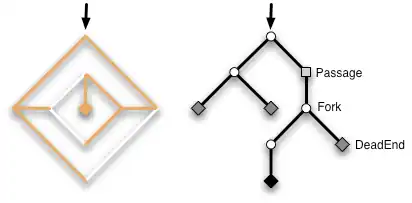 "But replacing the current top of the labyrinth with the corresponding sub-labyrinth this way is not an option, because the player cannot go back then." He pondered. "Ah, we can apply Ariadne's trick with the thread for going back. We simply represent the player's position by the list of branches their thread takes, the labyrinth always remains the same."