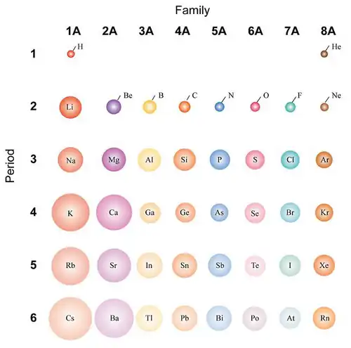 Therefore, the trend within a group or family on the periodic table is that the atomic size increases with increased number of energy levels. The Periodic Table below shows the trend of atomic size for groups. The arrow indicates the direction of the increase.