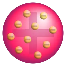 Figure 4.8: Thomson's "plum-pudding" model for the atom. Notice how the "plums" are the negatively charged electrons, while the positive charge is spread throughout the entire pudding batter.