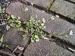 Hairy bittercress, Cardamine hirsuta, is a winter annual plant native to Europe and Asia, but also present in North America as an invasive weed. The plant is a member of the mustard family (Brassicaceae), and is edible as a bitter herb. Other common or country names include bittercress, land-cress and lamb's cress.