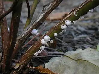 Lepidosaphes ulmi also known as oystershell scale are Scale Insects that is a pest on woody plants. The small insects attach themselves to bark and cause injury by sucking the tree's sap, this metabolic drain on the plant may kill a branch or the entire tree.