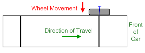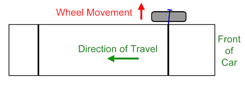 Toe/Steer: If the wheel moves to the body when the car is moved forward and to the axle head when the car is moved backward, then that wheel is toed in; the axle head is angled forward and should be adjusted rearward by shimming on the front side of the axle. If the wheel moves to the axle head when the car is moved forward and to the body when the car is moved backward, then that wheel is toed out; the axle head is angled backward and should be adjusted forward by shimming on the rear side of the axle.