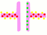 - The upswing is caused when positively charged sodium ions (Na+) suddenly rush through open sodium gates into a nerve cell. The membrane potential of the stimulated cell undergoes a localized change from -55 millivolts to 0 in a limited area. As additional sodium rushes in, the membrane potential actually reverses its polarity so that the outside of the membrane is negative relative to the inside. During this change of polarity the membrane actually develops a positive value for a moment(+30 millivolts). The change in voltage stimulates the opening of additional sodium channels (called a voltage-gated ion channel). This is an example of a positive feedback loop.