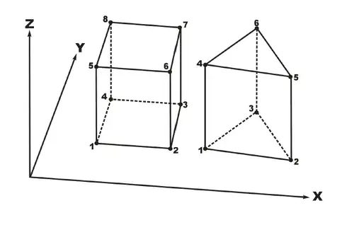 Currently, grok is capable of generating grids which are composed of either hexahedral blocks or triangular prisms. Figure 5.1 shows the local node numbering conventions for each of these elements and also the positive directions of the x, y, and z axes.