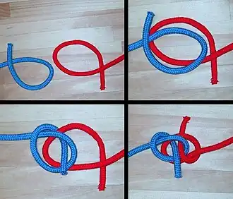- Pull either loose end once around the loop in the other rope, and then through the "tunnel" created by the two hitches