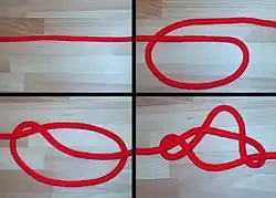 ![]() ![]() Use: The Man harness is a knot with a loop on the bight for non-critical purposes. This knot is used when multiple people are to pull a load. Typically one end of the rope is tied to a load, and one man harness knot per puller will be tied along its length. Each loop is then pulled by a different person.