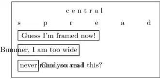 Makebox creates a single-line box, optionally of fixed width, but otherwise large enough to hold its contents. Note that the width does not have to be wider than the contents: for instance, setting width to 0 typesets the content without changing the current position. (E.g., this would allow for an overstrike.) Makebox is typically used to prevent hyphenation (see Hyphenation) or simply to keep text that belongs together from being placed on separate lines. You cannot place line breaks (\\) within a Makebox. mbox is the shorthand no-option version of Makebox.