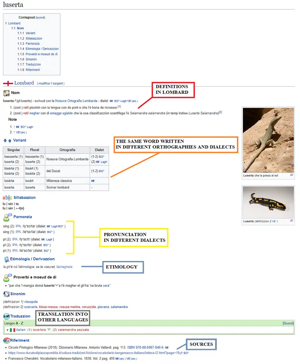 In the module about the orthography it was explained that Lombard historically has never had a common orthography, but there are different orthographies, each linked to the literary tradition of the main town and cities. For this reason it is difficult to find real dictionaries of Lombard language on the market, which as already mentioned is a cluster of dialects, but rather dictionaries of local dialects written in their historical orthographies. Furthermore, the available dictionaries do not give definitions in Lombard, but in reality translations from Lombard to Italian or from Italian to one of the variants of Lombard in a certain orthography. Furthermore, as regards the dictionaries, those available online are written in an archaic Italian, that of the mid-nineteenth century. Anyone wishing to write Lombard using the New Lombard Orthography could however get into trouble due to the need to convert words written with another orthography into the New Lombard Orthography. Precisely for this reason, within this course there will be modules whose purpose is to help in this orthographic conversion into the New Lombard Orthography, while the Lombard language wikictionary, written above all in New Lombard Orthography, aims to show within the same page the different ways of writing and pronouncing the same word in the different variants of the Lombard language.