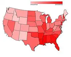According to myPersonality.org, different states within the North America demonstrate various levels of extroversion. Studies show that the southern states tend to display the most extroverted personality traits within the continental United States. By contrast, the Western half of the US is far more introverted than the East Coast (with the exception of Maine and Vermont).