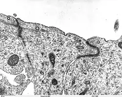 Transmission electron microscope image of a thin section cut through the developing brain tissue (telencephalic hemisphere) of an 11.5 day mouse embryo. This image of the luminal surface of the telencephalon, shows junctional complexes and pinocytotic vesicles. The junctional complex is divided into three types of junctions: 1) the most apical is the tight junction, which controls and/or restricts the movement of molecules across epithelial layers and helps maintain polarity, 2) the zonula adherens, which also includes the numerous actin filaments seen in the apical cytoplasm, and 3) the desmosome, which is a spot junction. The pinocytotic vesicles are formed from coated pits in the plasma membrane and are involved in endocytosis.