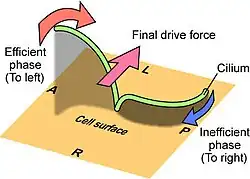 A highly specialized example of a molecular motor is the cilia which is found in the respiratory system, where it wafts mucous to the exterior, and in the fallopian tubes, where they waft along the ova to the uterus. The cilia is anchored in the cell membrane and sends its finger like projection upwards. Thes contain nine paired microtubules, with a central pair as shown in the accompanying electron microscope image. They beat backwards and forwards. The 'efficient' stroke is made with a stiff flagellum, the inefficient stroke with a relaxed flagellum.